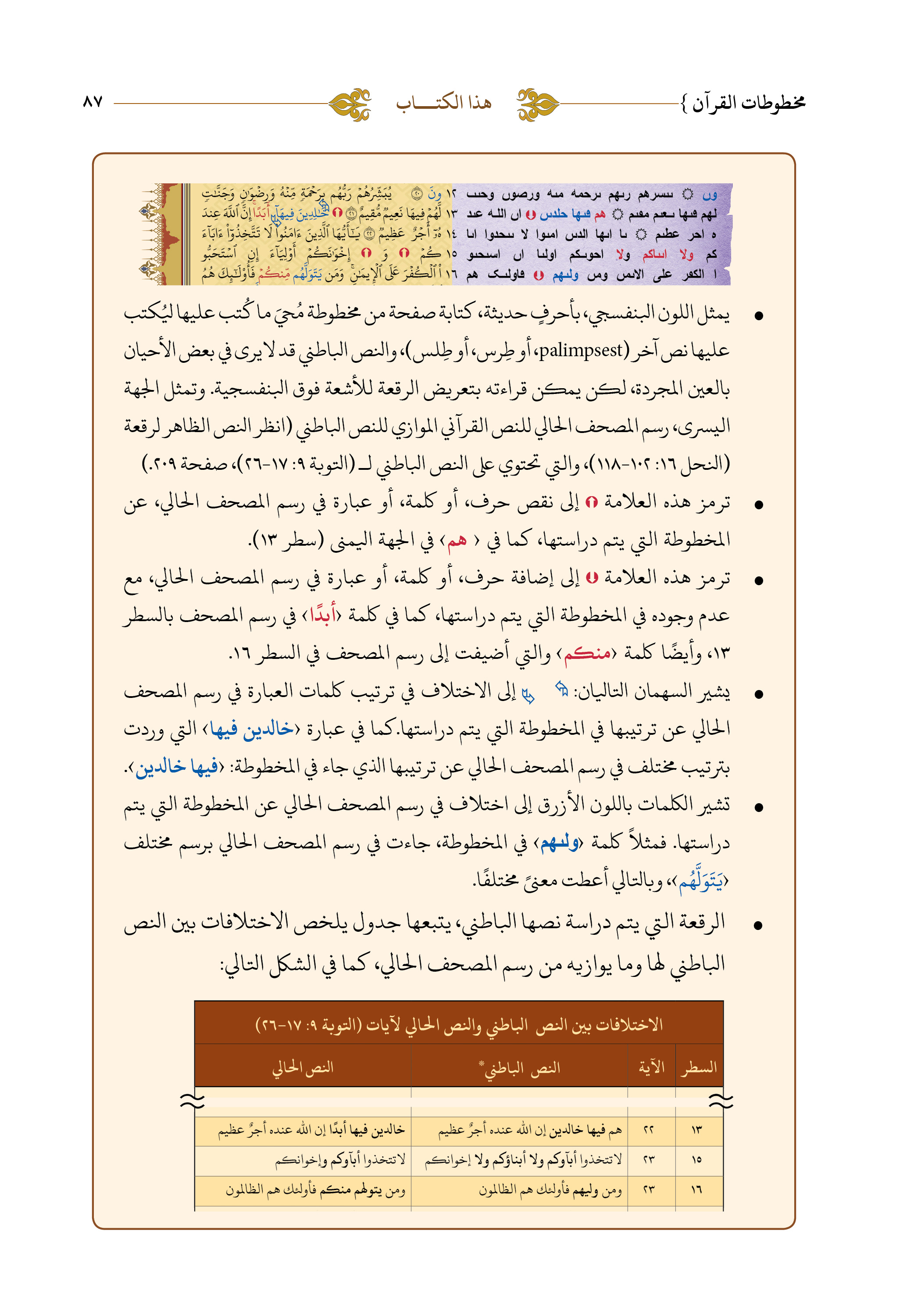 هذا البحث مدخل لعالم مجهول للكثير من المثقفين العرب والمسلمين، عالم مخطوطات القرآن القديمة، وهو محاولة للتعريف بأشهر وأقدم المخطوطات القرآنية، وترتيبها بحسب عمرها التقديري. يستعين الكاتب في ذلك بأدوات علمية فنية؛ كالتركيز على الخط والرسم والزخرفة وعلامات الوقف والمادة التي استخدمت لإنجاز هذه المخطوطات والمصاحف، ومحاولة معرفة عدد النساخ الذين ساهموا في تدوين هذه المخطوطة أو تلك. وتفسير وجود بعض الظواهر الإملائية التي تختلف عن قواعد الإملاء الحالية، ومقارنتها بما جاء في هذه المخطوطات. بعيدًا عن أي تعسف مذهبي أو ديني،كما يدعي تجار الإعجاز العلمي. وعمل الكاتب على توضيح الخلط في الفكر الشائع عن مخطوطات صنعاء بظنهم أنها مخطوطة واحدة، وتوضيح للاختلافات فيما بينها، وتعريف ببعض المجموعات التي تتكون منها، وخاصة طرس صنعاء الشهير DAM 01-27.1، ثم يُبين بالأدلة القاطعة عدم صحة ما روجّت له وسائل الإعلام يوم 22 يوليو 2015م عن مخطوطة برمنجهام Mingana Islamic Arabic 1572a حيث ادعت أنها ترجع إلى عصر الخلفاء الراشدين، ومنهم من أرجعها إلى عصر محمد نفسه.